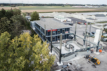 Das Material für den Druck wird in Silos gelagert. Der werksfertige Trockenmörtel wird nach Wasserzugabe direkt beim Druckvorgang in den Druckkopf gepumpt. Das für den Druck des Bürogebäudes in Hausleiten eingesetzte Material der Marke „Tector Print“ wurde von Holcim entwickelt und ist auf die besonderen Anforderungen des 3D-Betondrucks angepasst.