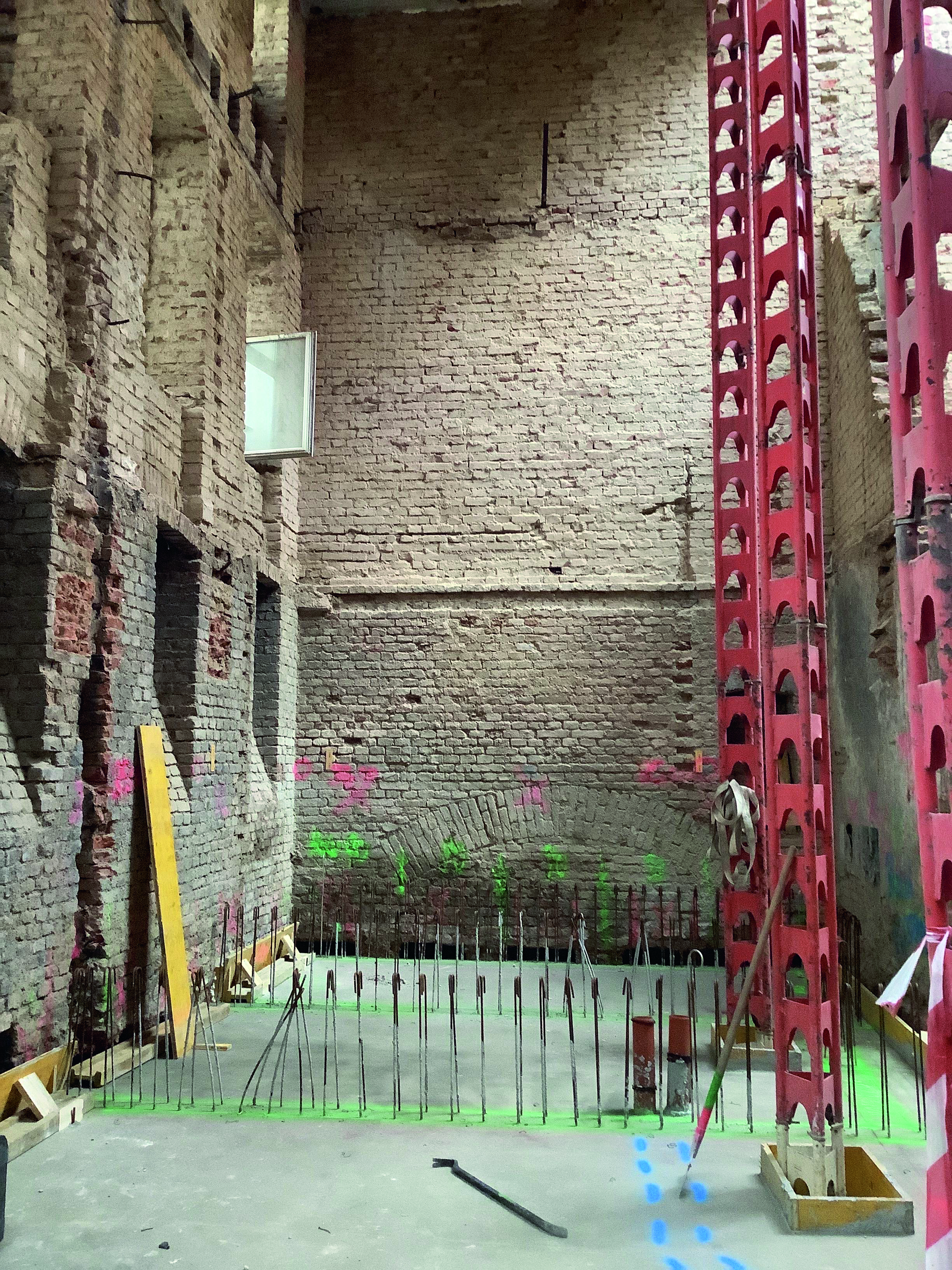 Die Außenwände der Gebäude wurden ausgesteift und sowohl durch Tief- als auch durch Diagonalstützen abgesichert, um die Geschosse nacheinander behutsam zu ertüchtigen. Ausgehend vom eingangs sanierten ersten Stock hat man sich so immer weiter nach oben und unten vorgearbeitet.