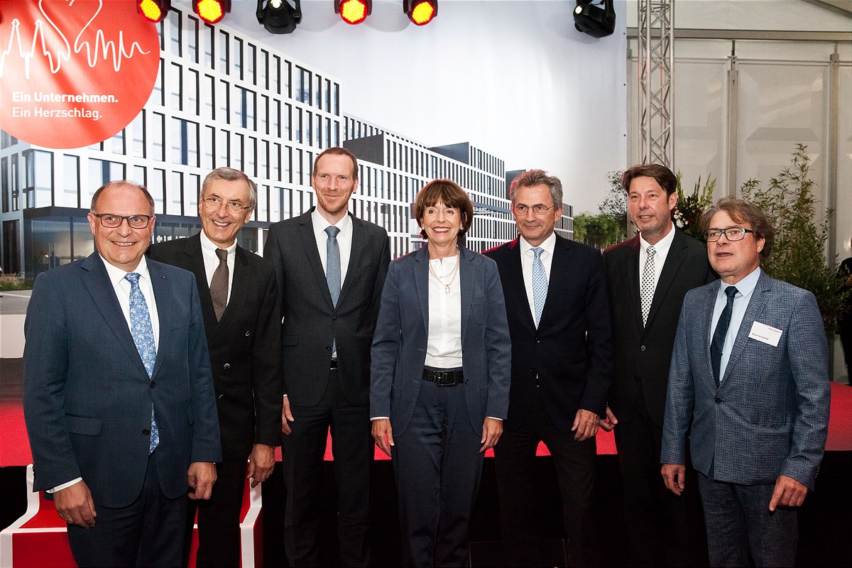 - Gute Stimmung bei der heutigen Einweihungsfeier mit viel Prominenz: v.l.n.r.: Markus Kaller (Mitglied des Vorstands der STRABAG AG), Dr. Thomas Birtel (Vorstandsvorsitzender STRABAG SE), Dr. Jan Heinisch (Staatssekretär im Ministerium für Heimat, Kommunales, Bau und Gleichstellung des Landes Nordrhein-Westfalen), Henriette Reker (Oberbürgermeisterin der Stadt Köln), Christian Hattendorf (Mitglied des Vorstands der STRABAG AG), Peter Hübner (Mitglied des Vorstands der STRABAG AG), Rainer Schäfer (Geschäftsführer STRABAG Real Estate GmbH)