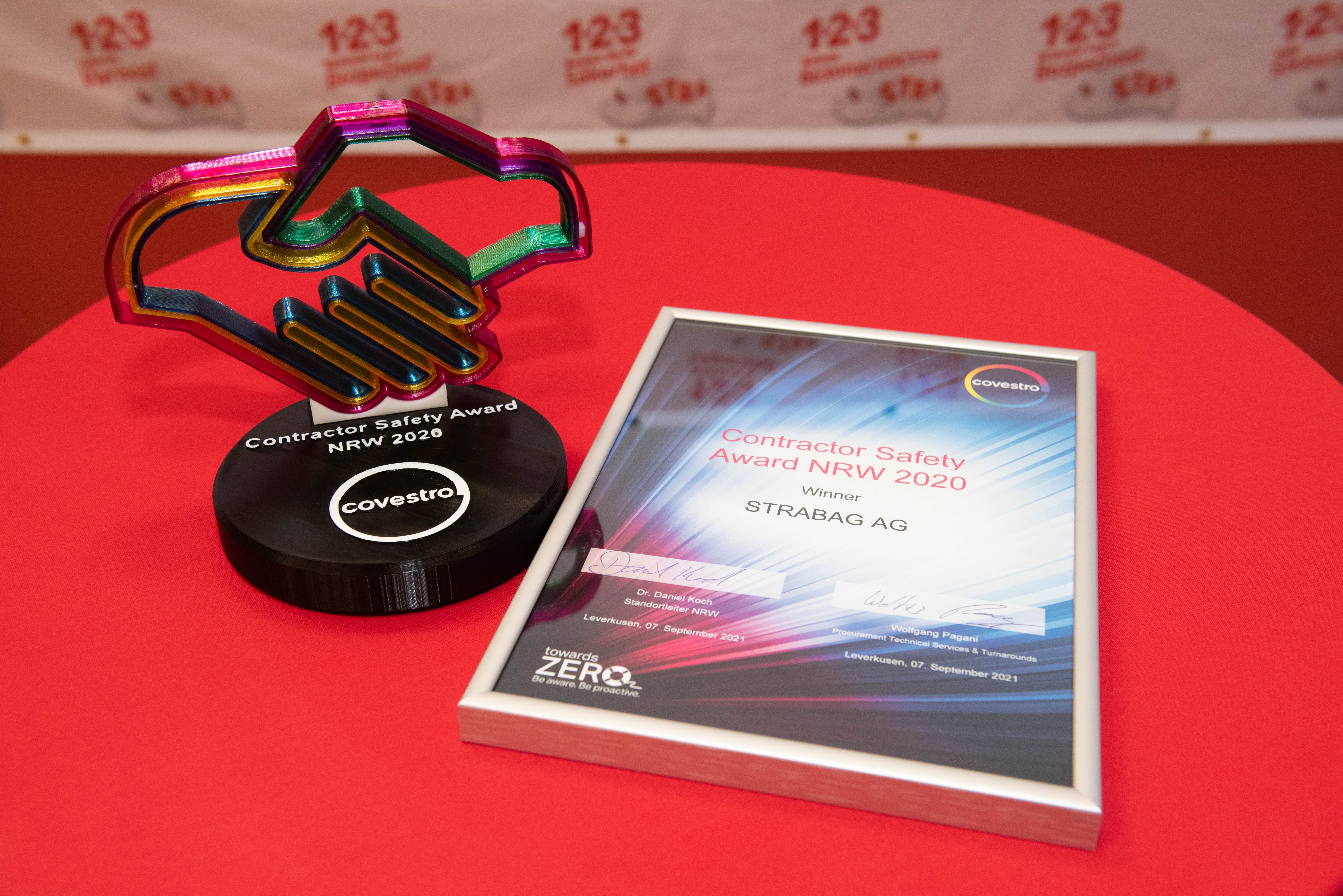 Mit dem Kontraktoren Safety Award NRW prämiert Covestro jährlich diejenige Partnerfirma, die an den Covestro-Produktionsstandorten in Leverkusen, Dormagen und Krefeld-Uerdingen im Zeitraum eines Jahres eine hervorragende Unfallstatistik vorweisen kann. Darüber hinaus muss sie sehr gute Ergebnisse bei unangekündigten Sicherheitsbegehungen und -zertifizierungen erzielen.