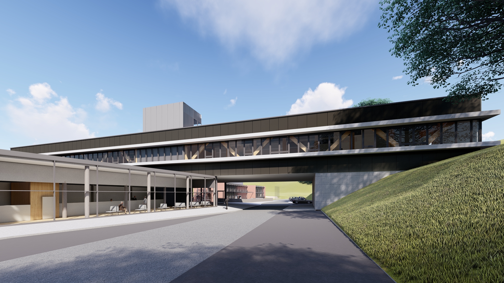 - Imposante Holzfachwerkträger durchziehen das verbindende Brückengebäude