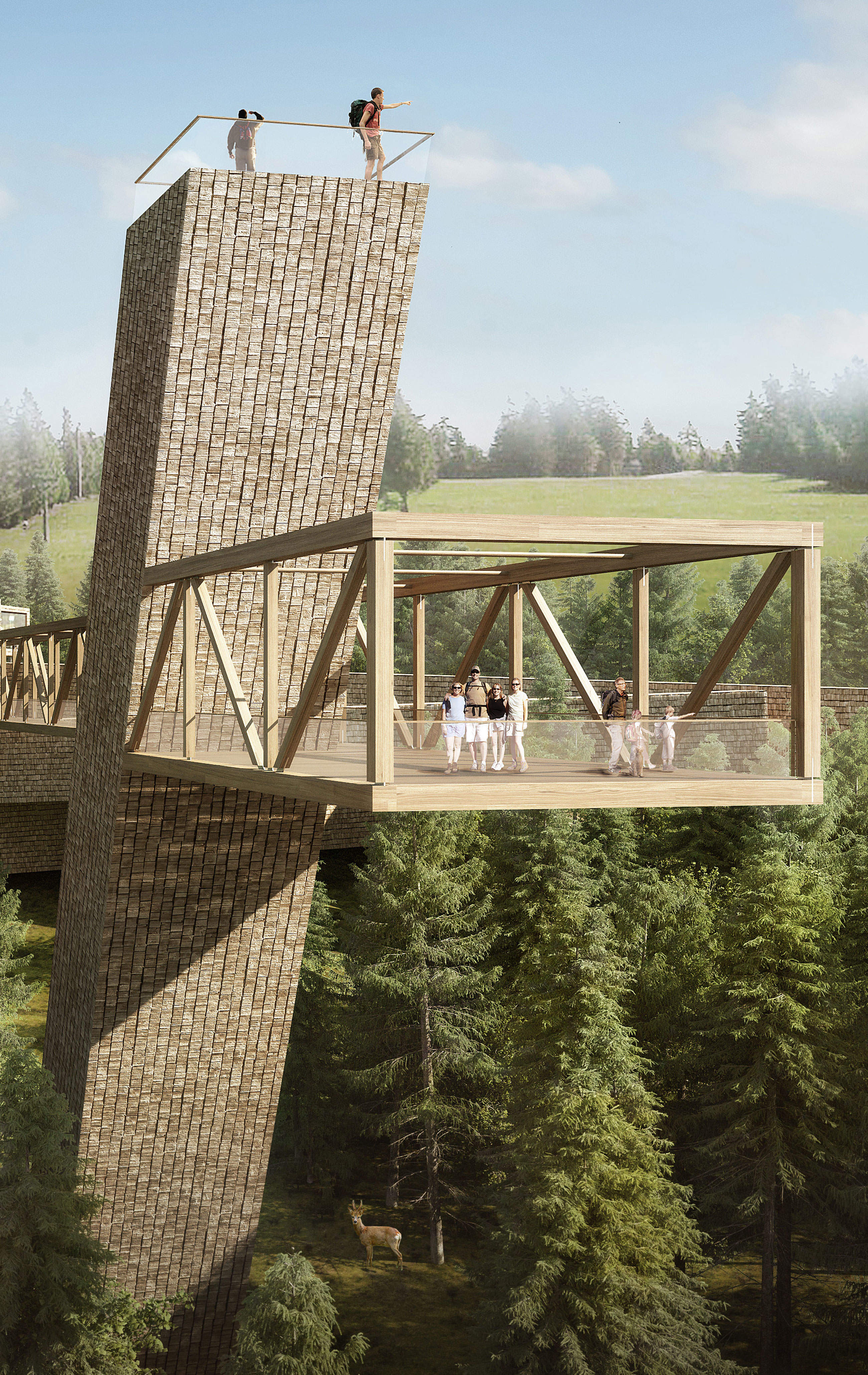Die Architektur des Nationalparkzentrums am 915 m hohen Ruhestein greift das Bild eines naturbelassenen Waldes auf: Die ein- bis zweigeschossigen, bis zu 65 m langen Gebäuderiegel liegen wie Mikadostäbe kreuz und quer übereinander und sollen so an die zufällige Stapelstruktur entwurzelter Bäume erinnern. Optische Highlights sind der um 15 Grad geneigte, 35 m hohe Aussichtsturm und der breite hölzerne Skywalk als Verbindung zum Besucherzentrum. Passend zum Konzept wurde als optisch dominierendes Material Holz – insbesondere regionale Weißtanne – verbaut.