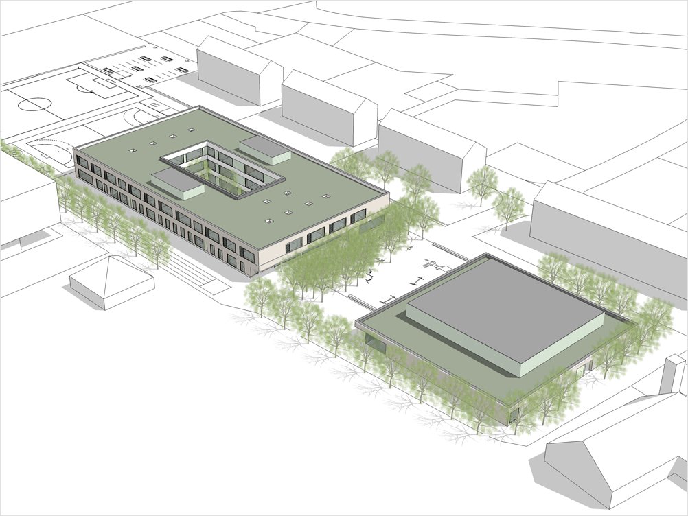 Das Gesamtprojekt umfasst den Neubau des Schulgebäudes mit zwei Obergeschossen und einem Untergeschoss sowie der Sporthalle (rd. 1.800 m2). Im Schulgebäude entstehen auf rd. 6.700 m2 u.a. eine Mensa, 20 Klassenzimmer sowie Räume für die Arbeit in Kleingruppen.