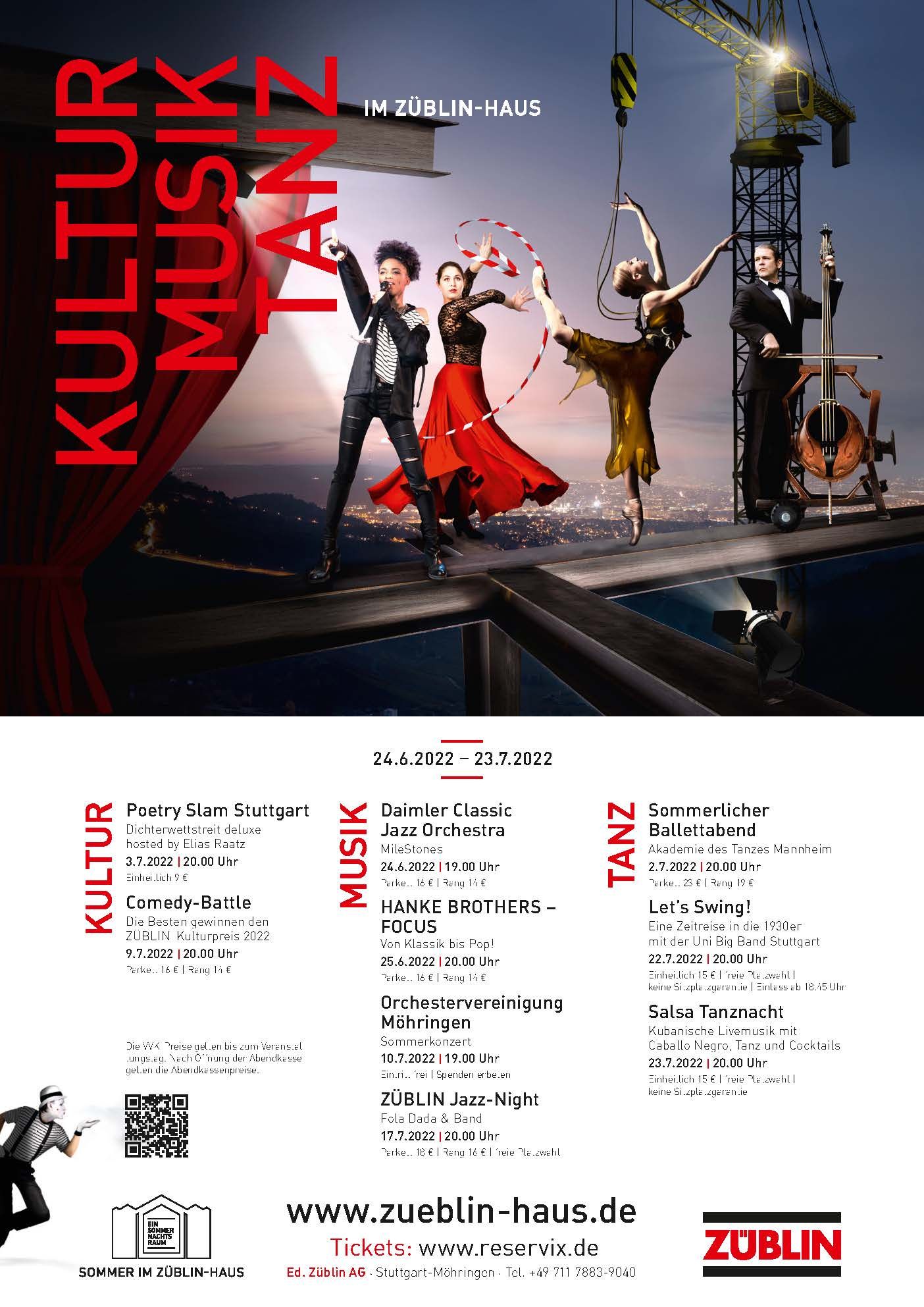 Vom 24.6. bis 23.7.2022 lädt ZÜBLIN wieder zu einem Kultursommer in das lichtdurchflutete Atrium seines Stuttgarter Konzernhauses ein, nachdem die beliebte Kulturreihe „Sommer im ZÜBLIN-Haus“ in den letzten zwei Jahren aufgrund der Corona-Pandemie ausfallen musste. An insgesamt neun Abenden erwartet das Publikum ein abwechslungsreiches Kulturprogramm, das von Jazz und Ballett bis hin zu Poetry Slam und Stand-Up-Comedy reicht.