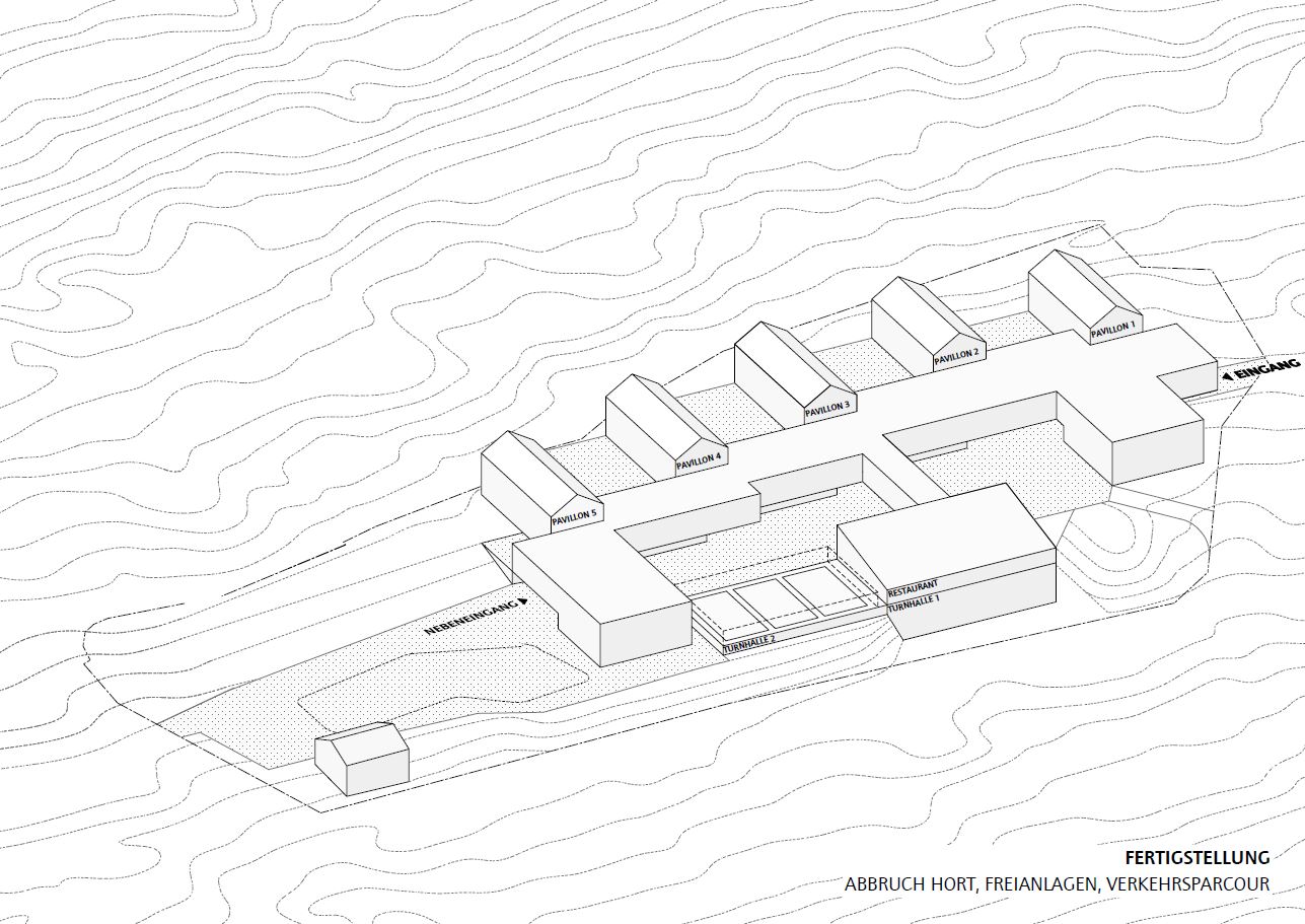 Vier der fünf Bestandsgebäude dienen künftig als sogenannte Lernhäuser nach Jahrgangsstufe mit bis zu fünf Klassen. Im fünften Bestandshaus findet die Ganztagsbetreuung statt. Fachräume, Mensa und Sporthallen können dann über eine barrierefreie Verbindung über die Ergänzungsbauten erreicht werden. Die neue Turnhalle entsteht direkt neben der Bestehenden, auf der ergänzend ein „Kinderrestaurant“ und ein großer Mehrzweckraum für Veranstaltungen entsteht.