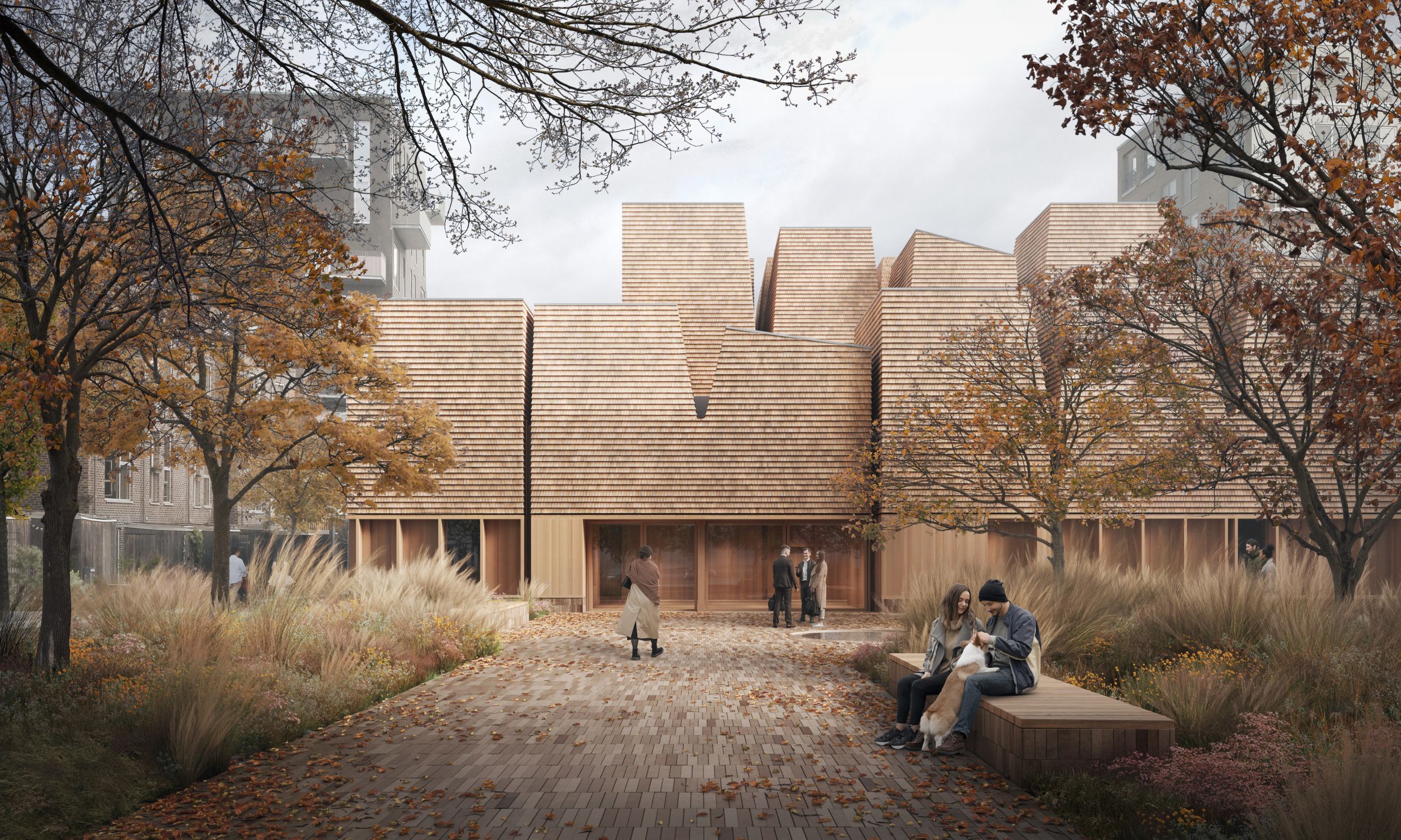 Inspired by the canopy of a forest, the church’s distinctive roof design and interior evoke the natural beauty of trees. The façade will be clad in Canadian cedar shingles made entirely of tree scraps, which will naturally weather over time to develop a silver-grey patina. On the ground floor, the façade also features recessed timber-clad window niches with built-in seating. The project is targeting DGNB Gold certification for sustainability.